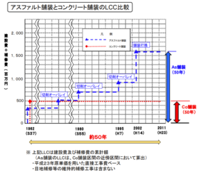 コンクリート舗装が採用される理由の一つがライフサイクルコストです。アスファルトは材料などのイニシャルコストは安いですが、定期的に補修が必要となります。